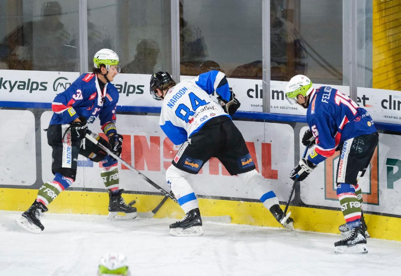 Nur wenige Minuten nach Wiederbeginn hatte Ritten die Chance im 5-gegen-3. Und die Buam nutzten diese Chance auch durch Brett Welychka, der vor dem Tor alleingelassen ins kurze Eck traf. In der Folge kam Wipptal etwas glücklich zum Anschlusstreffer: Eine Hereingabe von Conci landete vom Schlittschuh von Marco Marzolini im Tor der Buam. Die Broncos bekamen daraufhin Überwasser, dominierten den Rest des zweiten Drittels und erzielten durch Bryson Cianfrone den Ausgleich, der einen Rebound ins leere Tor bugsierte.Liam Nardon im Zweikampf mit Manuel Öhler und Leonardo Felicetti. © Max Pattis