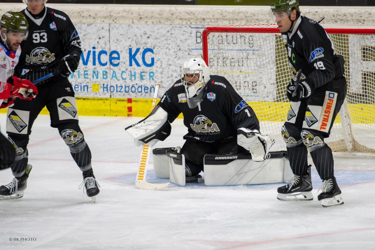 Ein zweites Südtiroler Derby ging in der MeranArena zwischen den Hausherren und dem HC Gröden über die Bühne. Lange Zeit waren die beiden Teams ebenbürtig, das erste Tor fiel bei Halbzeit der Partie: Im Powerplay brachte Rasmus Nousiainen den Puck auf das Tor, wo Daniel Gellon sträflich allein gelassen wurde und den Nachschuss zum 1:0 verwertete (30.). Wenig später war Meran im Pech, als Youngster Enrico Larcher nur den Pfosten traf.Andreas Bernard im Meran-Tor war ein sicherer Rückhalt und wies eine Fangquote von 96,2 Prozent auf. © BK Photo