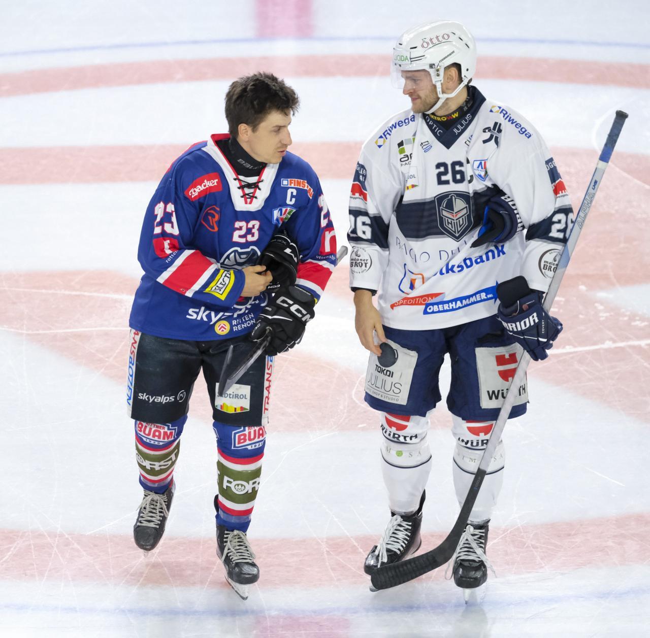 Im zweiten Drittel übernahmen die Buam die Kontrolle über das Spielgeschehen, doch die Gäste verteidigten sich geschickt. Eine feine Einzelleistung von Diego Cuglietta brachte die Buam endlich auf die Anzeigetafel: Er eroberte sich in der Mitte der Eisfläche den Puck, schlug zwei Hacken und blieb vor Gäste-Goalie Tizian Giovanelli eiskalt (36.). Mit diesem Zwischenstand ging es zum zweiten Mal in die Pause.Kapitäne unter sich: Simon Kostner (Rittner Buam, links) und Tobias Brighenti (Unterland Cavaliers, rechts). © Max Pattis