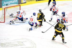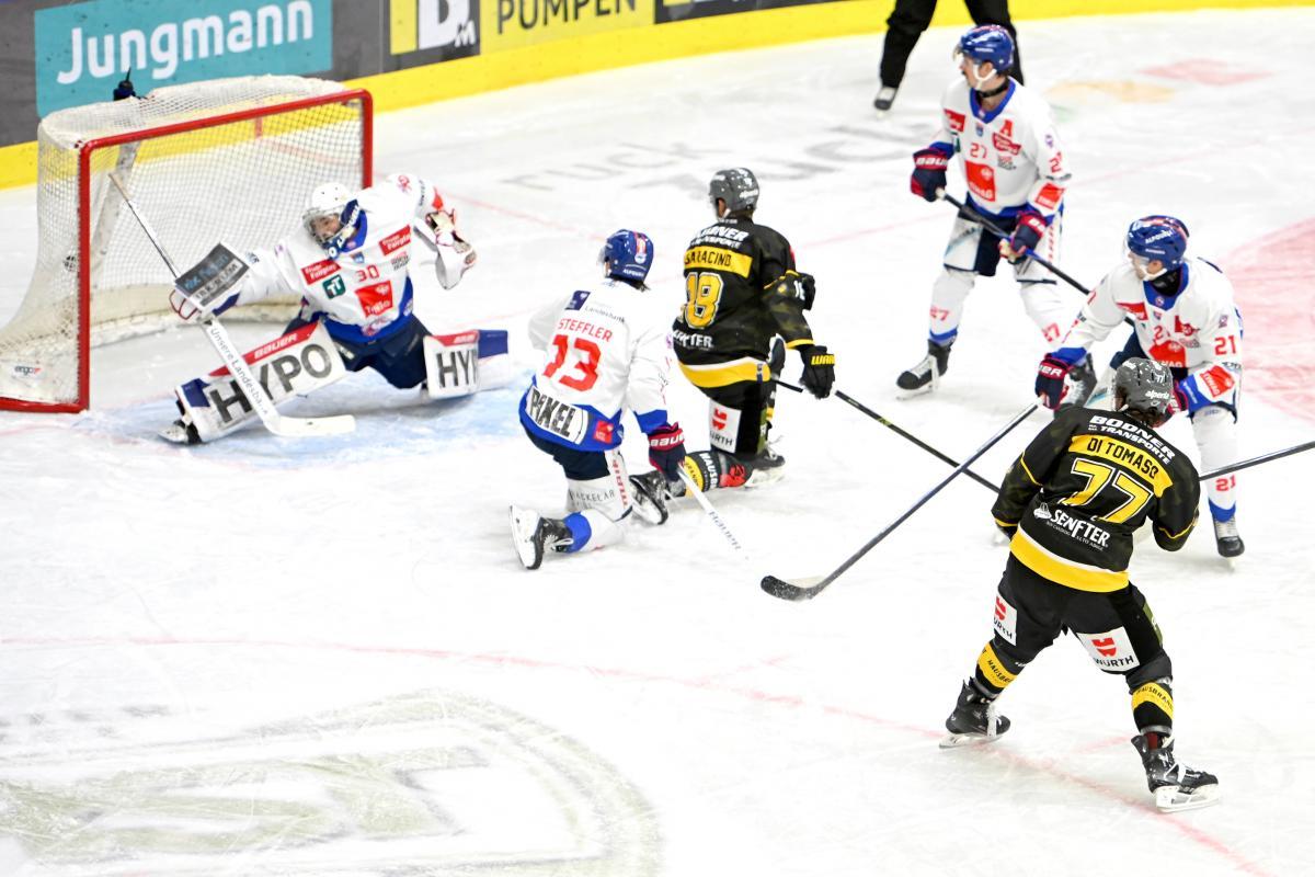 | Kapitale Fehler | Mit der Führung im Rücken wird der HCP fahrlässig: Dem 1:2 durch Marcel Witting geht ein Lauridsen-Fehlpass voraus. Kurz darauf läuft auch Lukas Bär nach einem DiTomaso-Bock alleine auf Pasquale zu, er bleibt jedoch am Kanadier hängen. |