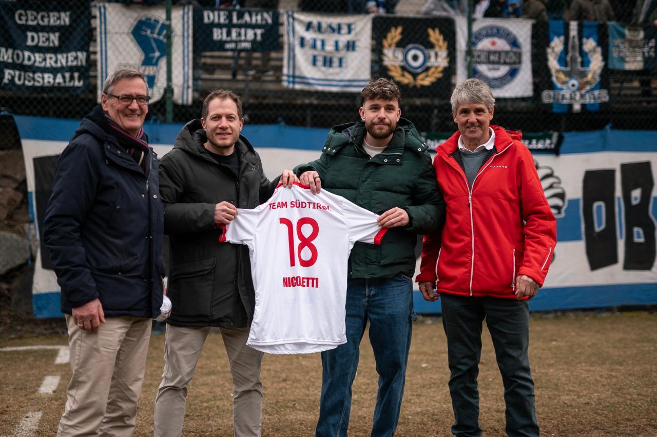 Das Europeada-Team Südtirols hat Andreas Nicoletti während der Halbzeit-Pause der Partie zwischen Obermais und Vigasio ein Trikot überreicht. Der Gargazoner darf seit einem Herzstillstand im Sommer nicht mehr Fußball spielen.
