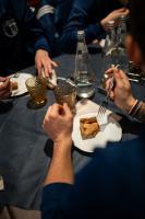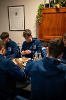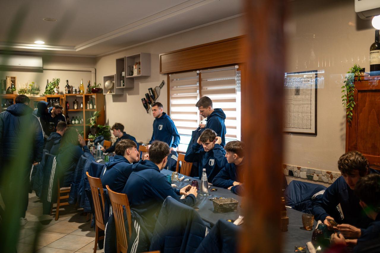 „Um 11 Uhr kommen wir im Restaurant, wo es Mittagessen gibt, an. Die Stimmung ist gelassen, es wird allerhand Blödsinn geredet. Über das Spiel wird kaum gesprochen. Es gibt zwei Tische. Am einen sitzen die Spieler, am anderen der Betreuerstab.Die Obermais-Mannschaft im Restaurant. Um 11 Uhr gibt es Mittagessen.