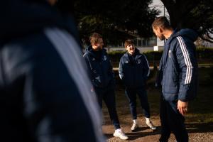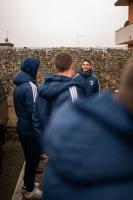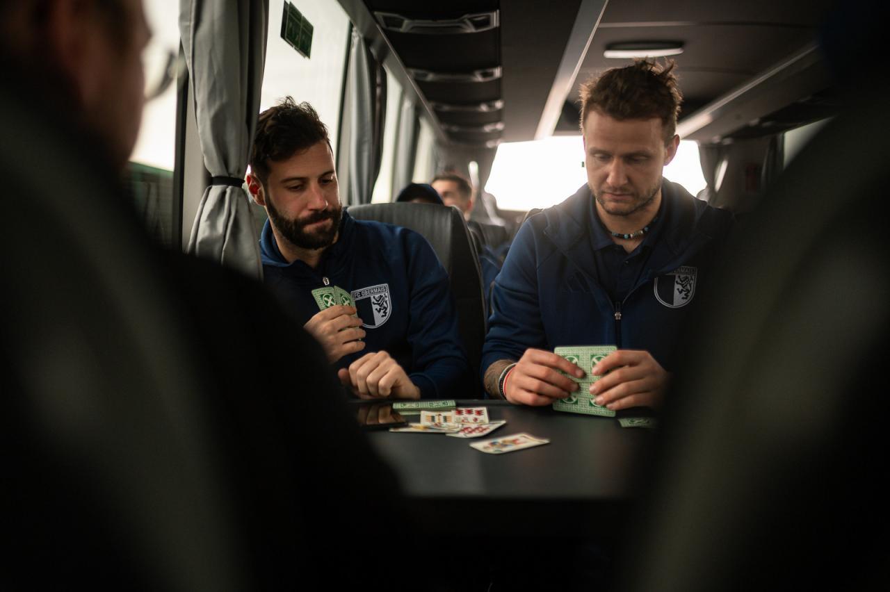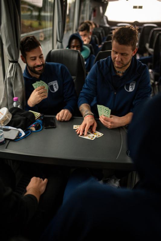 Nach dem Umziehen hält der Trainer eine kurze Ansprache. Ein paar Spielen machen eine Aktivierung, dann geht es zum Aufwärmen. Das leitet zuerst unser Athletiktrainer, dann Co-Trainer Mussi. Kurz vor dem Anpfiff gehen wir noch einmal in die Kabine, wo die letzten Handgriffe gemacht werden. Die letzte Motivationsrede hält immer ein Spieler. Es ist immer jemand anderes, je nachdem wer sich gerade dafür bereit fühlt.“Die Heimreise