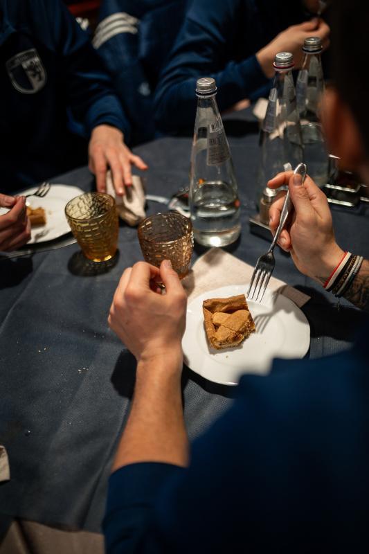 An einem der Vierertische wird Karten gespielt. Marco Paulmichl, Samuel Villgrattner, Martin Ciaghi und Michael Unterthurner gehören zur fixen Wattergruppe. Ich spiele nur bei der Heimfahrt und das auch nur, wenn wir gepunktet haben. Ich habe meine Bücher mit. Thema: Mentales Training. Oder ich höre Podcats und versuche zu entspannen. Irgendwann bleiben wir bei einem Autogrill stehen. Wir gehen Kaffeetrinken und spielen „gratta e vinci“. Unser Betreuer Marek Malatinec gewinnt immer ein paar Euro, alle anderen verlieren konstant ihr Geld.“Das Mittagessen
