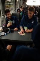 „Ich stehe um 6 Uhr auf. Es gibt Frühstück, noch einmal Kohlenhydrate. Dazu esse ich Haferflocken, Nüsse und ein paar Supplements. Danach mache ich meine Mobility-Übungen, die brauche ich immer. Zwischen 7 und 7.30 Uhr treffen wir uns auf der Lahn, von wo aus wir mit den Vereins-Pullmini nach Bozen fahren. Dort wartet ein Bus von Latemar Reisen auf uns. Im Bus hat jeder seinen Zweierplatz. Es ist ruhig, viele schlafen noch ein bisschen.Martin Ciaghi und Marco Paulmichl (r.) beim Kartenspielen.