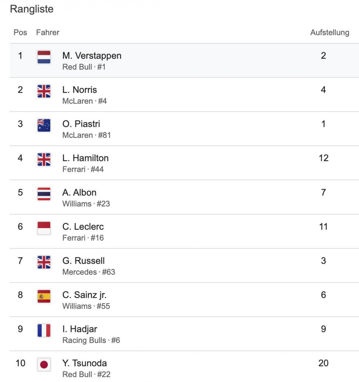 Der Formel-1-Weltmeister gewann am Sonntag das erste Europa-Rennen dieser Saison nach einem Überholmanöver in der ersten Runde gegen McLaren-Pilot Oscar Piastri, der als Dritter etwas von seiner WM-Führung einbüßte. Zweiter wurde Piastris Teamkollege Lando Norris. Lewis Hamilton gelang als Vierter im Ferrari-Heimrennen ein Achtungserfolg.