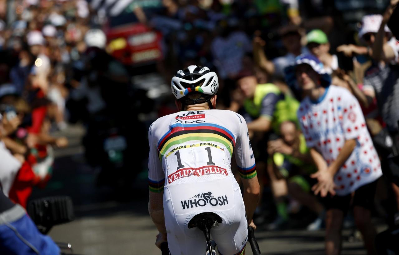 Rad-Weltmeister Tadej Pogacar rauschte alles andere als angeschlagen hinauf nach Hautacam. Mit einer seiner explosiven Attacken am steilen Schlussanstieg hat der Slowene die komplette Konkurrenz düpiert und in den Pyrenäen vor den Augen des französischen Präsidenten Emmanuel Macron seine Muskeln spielen lassen.