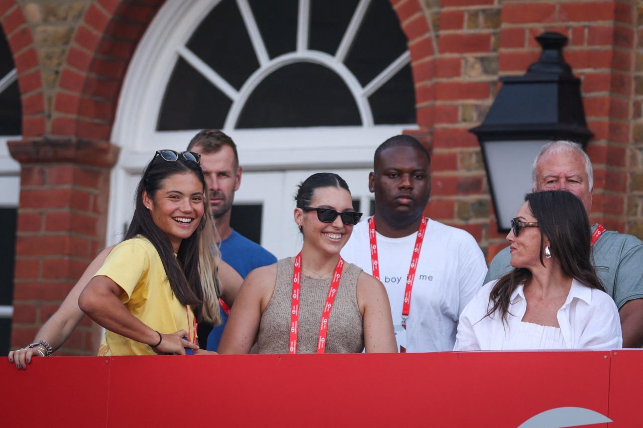 Vergangene Woche wurde bekannt, dass Alcaraz und Raducanu bei den US Open im reformierten Mixed-Doppel zusammen an den Start gehen werden. Eine Nachricht, die die Herzen vieler Tennisfans höherschlagen ließ, immerhin sind die beiden zwei der populärsten Tennisspieler der Welt. Der Spanier holte bislang fünf Grand-Slam-Titel, die Britin schrieb 2021 Geschichte, als sie die US Open gewann – und zwar als Qualifikantin.Raducanu (ganz links) verfolgte das Alcaraz-Match auf der Tribüne. © AFP / ADRIAN DENNIS