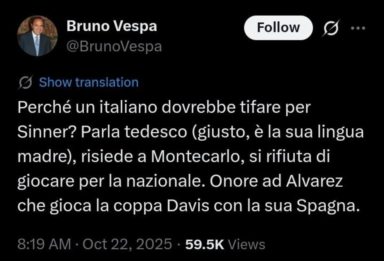 Bruno Vespa gehört zu den bekanntesten Gesichtern im italienischen Fernsehen, und auch er äußerte sich auf X, ehemals Twitter, kritisch zur Sinner-Absage. „Warum sollte ein Italiener ein Fan von Sinner sein? Er spricht Deutsch (richtig, das ist seine Muttersprache), er wohnt in Monte-Carlo und er weigert sich, für die Nationalmannschaft zu spielen“, so Vespa.