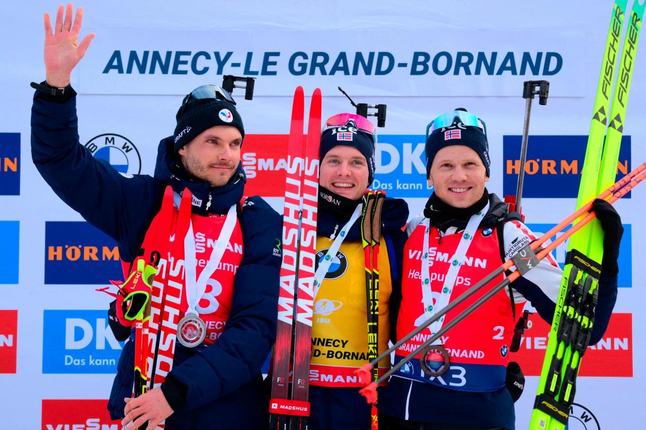Das Podium mit Emilien Jacquelin, Johan-Olav Botn und Johannes Dale-Skjevdal. © APA/afp / OLIVIER CHASSIGNOLE