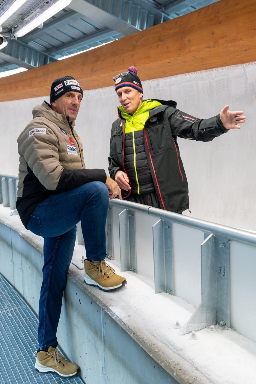 „Wir wollen alle unbedingt einen Heim-Weltcup, aber wir können es nicht erzwingen und müssen ehrlich bleiben“, meinte der frühere Weltmeister Jonas Müller laut Krone. „Von den Kurven 13 und 14 geht eine zu große Verletzungsgefahr aus. Nicht auszudenken, wenn ich von weiter oben starte und mit höherer Geschwindigkeit unterwegs bin.“ Der 28-Jährige touchierte bei seiner Testfahrt die Banden mehrmals, nach nur einem Versuch war für den dreimaligen Europameister Schluss.ÖRV-Präsident Markus Prock (links) und FIL-Funktionär Thomas Schwab. © APA / EXPA/JOHANN GRODER