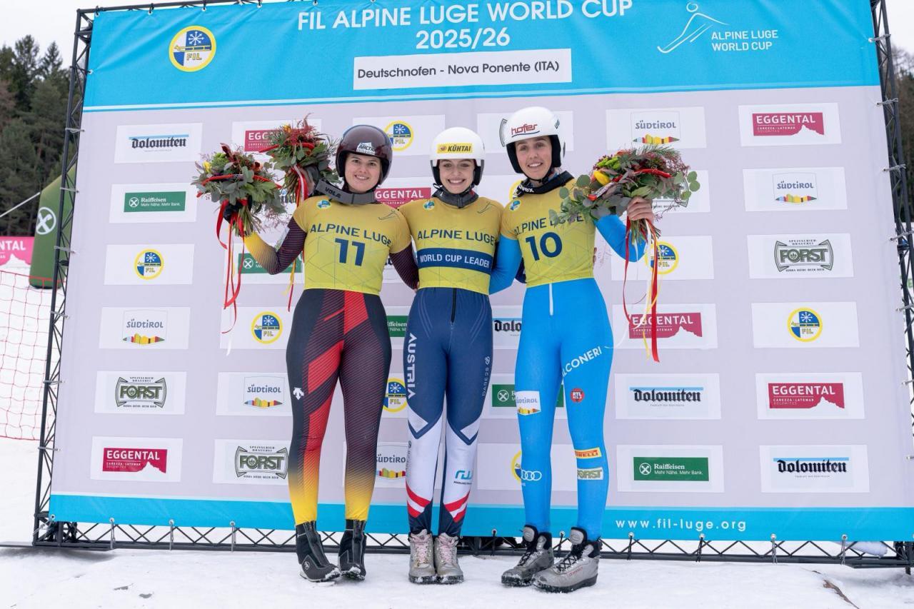 Im Einsitzer der Damen hat Riccarda Ruetz (AUT) für eine Premiere gesorgt. Mit ihrem dritten Saisonsieg holte sie zugleich den ersten Damen-Weltcupsieg für Österreich auf der „Pföslriep“. Mit einer Gesamtzeit von 1.52,47 Minuten blieb Ruetz als einzige Läuferin unter 1.53 Minuten. „Das waren zwei nahezu perfekte Fahrten, dass ich die erste Österreicherin bin, die hier gewinnt, wusste ich nicht – das freut mich umso mehr“, strahlte die Tirolerin im Ziel.Jenny Castiglioni (r.) wurde Dritte.