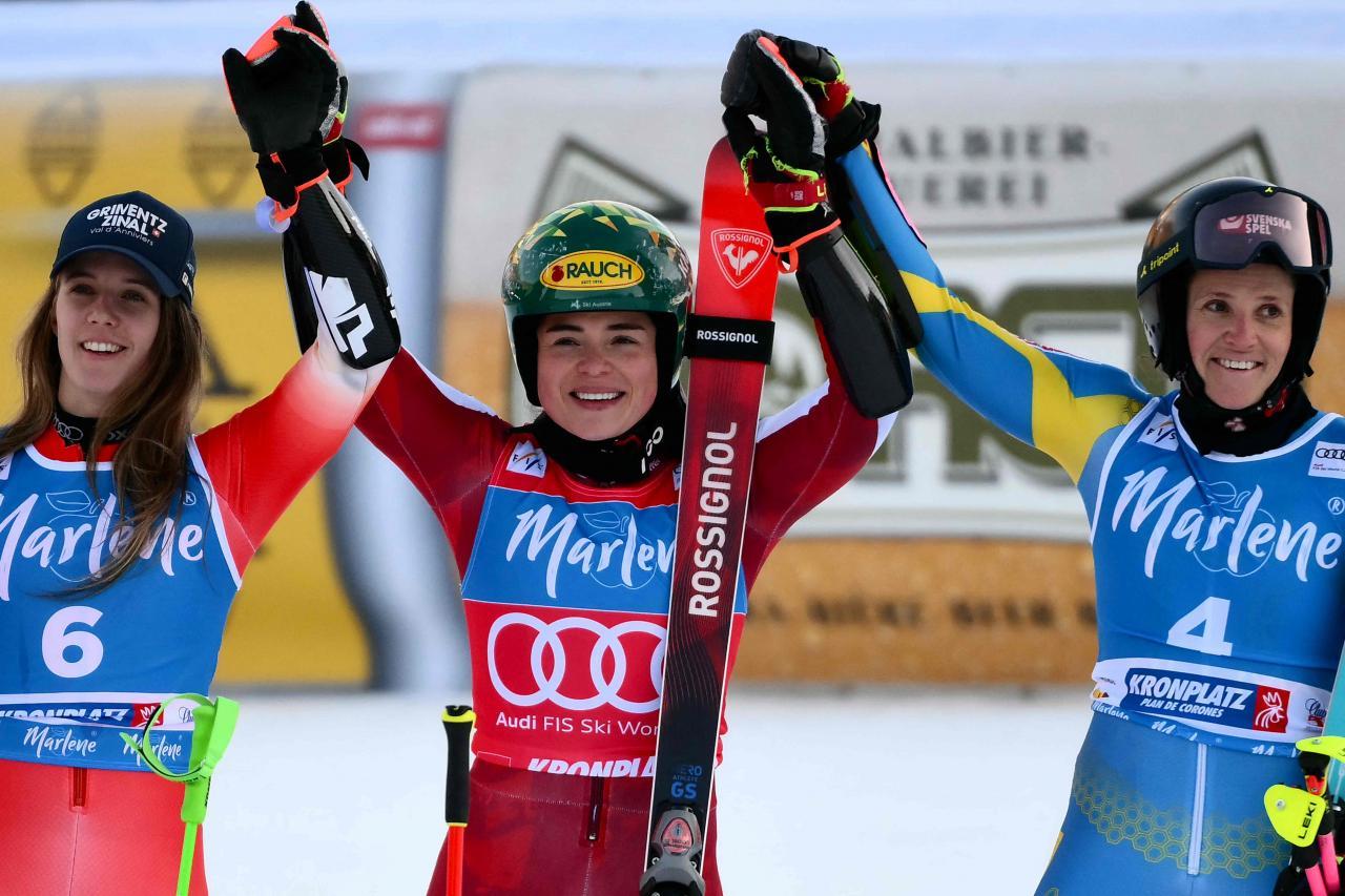 Brignone hat mit ihren Leistungen also überrascht. Weniger überraschend war, dass sich am Ende Julia Scheib den Sieg holte. Die Österreicherin, die zur Halbzeit noch auf Rang 3 lag, zauberte im Finale eine Fabelfahrt in den Schnee und raste mit Laufbestzeit zu ihrem bereits vierten Riesentorlaufsieg in dieser Saison. Ihre erste Kristallkugel rückt also immer näher.Das Podest, von links Camille Rast (2.), Julia Scheib (1.) und Sara Hector (3.). © APA/afp / MARCO BERTORELLO