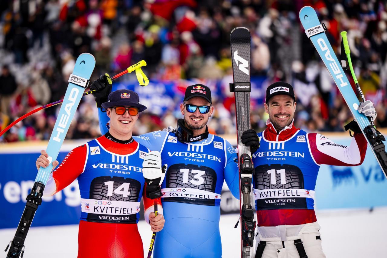 Franjo von Allmen, Dominik Paris und Vincent Kriechmayr standen am Samstag auf dem Podest. © ANSA / JEAN-CHRISTOPHE BOTT