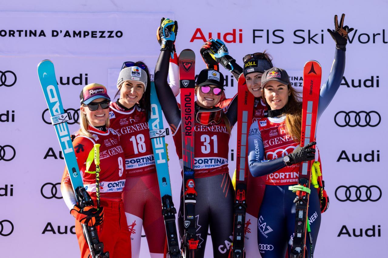 Christina Agers Karriere begann einst mit einem lauten Knall. In ihrem allerersten Weltcuprennen – dem Slalom von Levi 2013 – fuhr sie mit Startnummer 53 sensationell auf Rang 4. Es dauerte jedoch nicht lange, bis sie in den Speed-Bereich wechselte – und sich bald mit schweren Verletzungen auseinandersetzen musste. Unter anderem riss sie sich innerhalb von acht Monaten zwei Mal das Kreuzband.Ein äußerst kurioses Podest im Jänner 2024, von links: Lara Gut-Behrami (2.), Stephanie Venier (1.) sowie die drei Drittplatzierten Valerie Grenier, Christina Ager und Sofia Goggia. © ANSA / ANDREA SOLERO