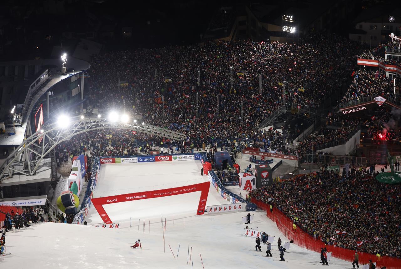 Einen starken zweiten Lauf zeigte Alex Vinatzer. Der Grödner machte im Finale neun Plätze gut und wurde am Ende noch starker Siebter. Ein versöhnliches Ende der beiden Schladming-Tage für Vinatzer, nachdem er am Vortag im Riesentorlauf auf dem Weg zu einem Top-Ergebnis ausgeschieden war.Eine Ansicht des Planai-Zielstadions während der Fahrt von Manuel Feller. © APA / ERWIN SCHERIAU