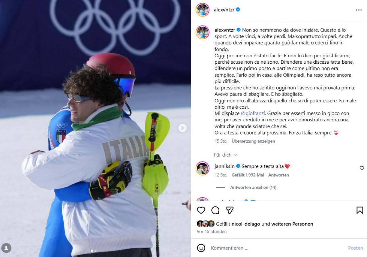 Unter dem Beitrag, der innerhalb von Stunden Tausende Likes sammelte, meldeten sich zahlreiche Fans und Athleten zu Wort, um Vinatzer aufzumuntern. Darunter auch Jannik Sinner. Mit seinem offiziellen Profil kommentierte der Sextner: „Immer den Kopf nach oben!“ Daneben fügte er ein Herzchen an.